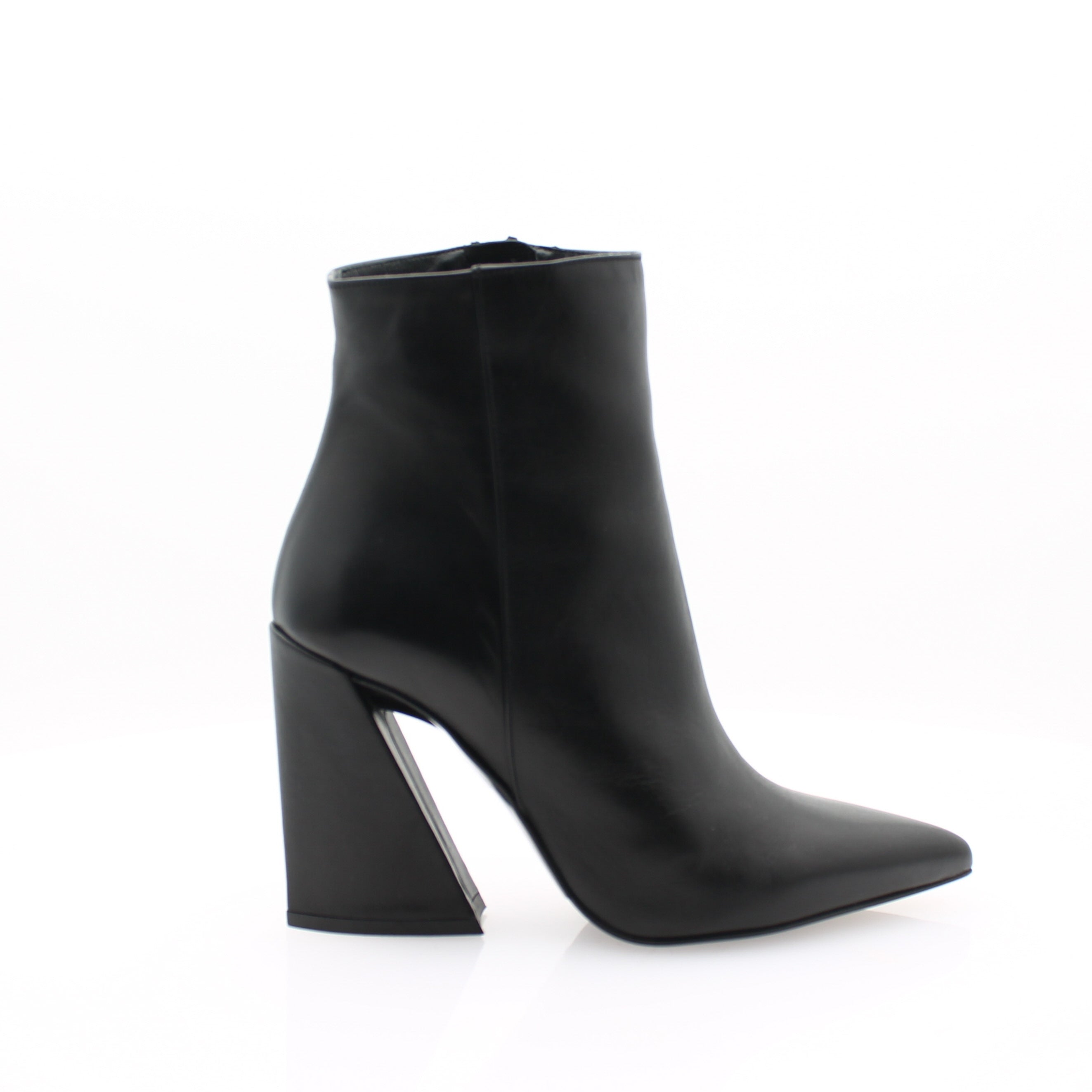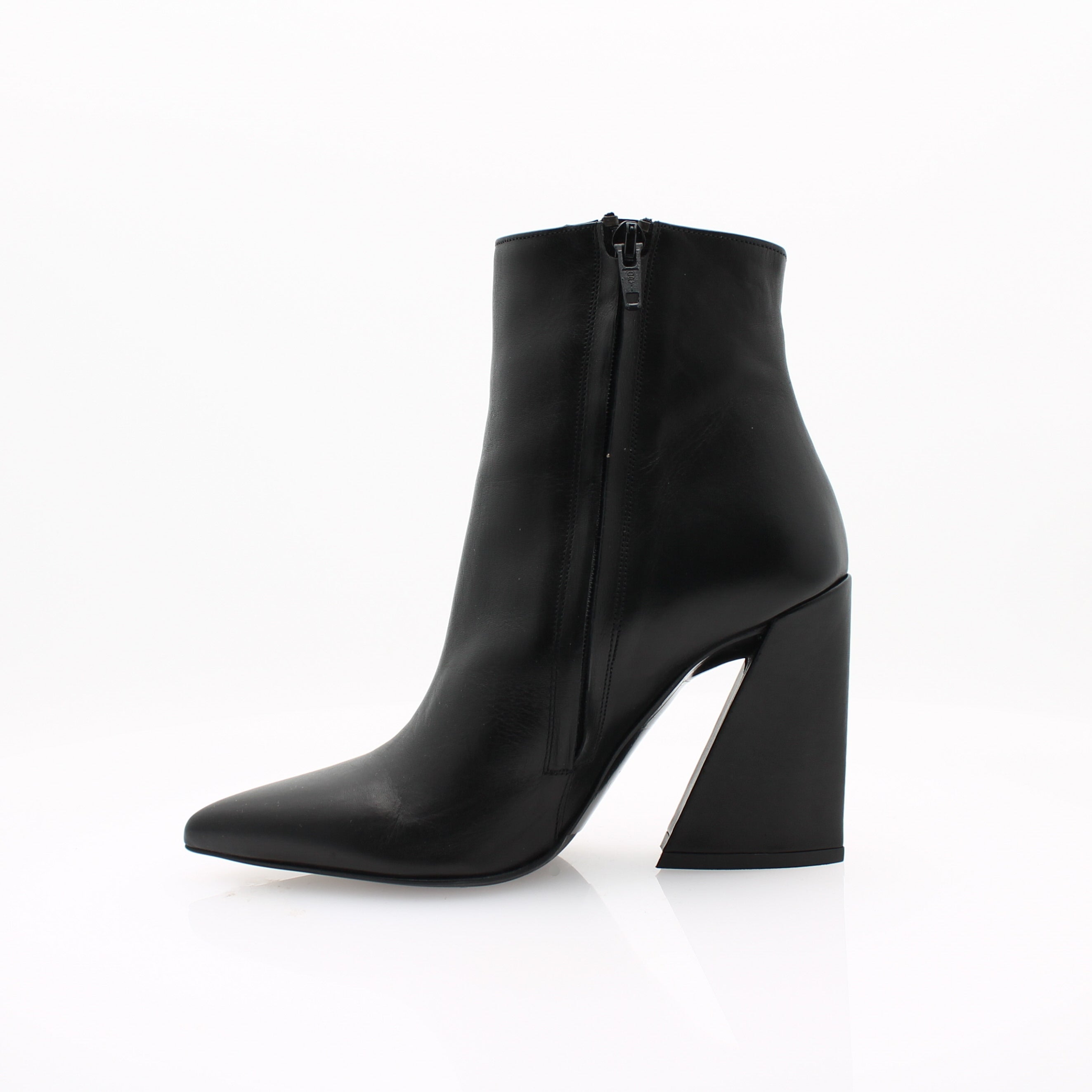 Ces bottines Albano en cuir lisse noir affichent une silhouette résolument contemporaine. Leur bout pointu confère une touche de sophistication, tandis que leur talon géométrique de 10 cm affirme un style unique et audacieux.