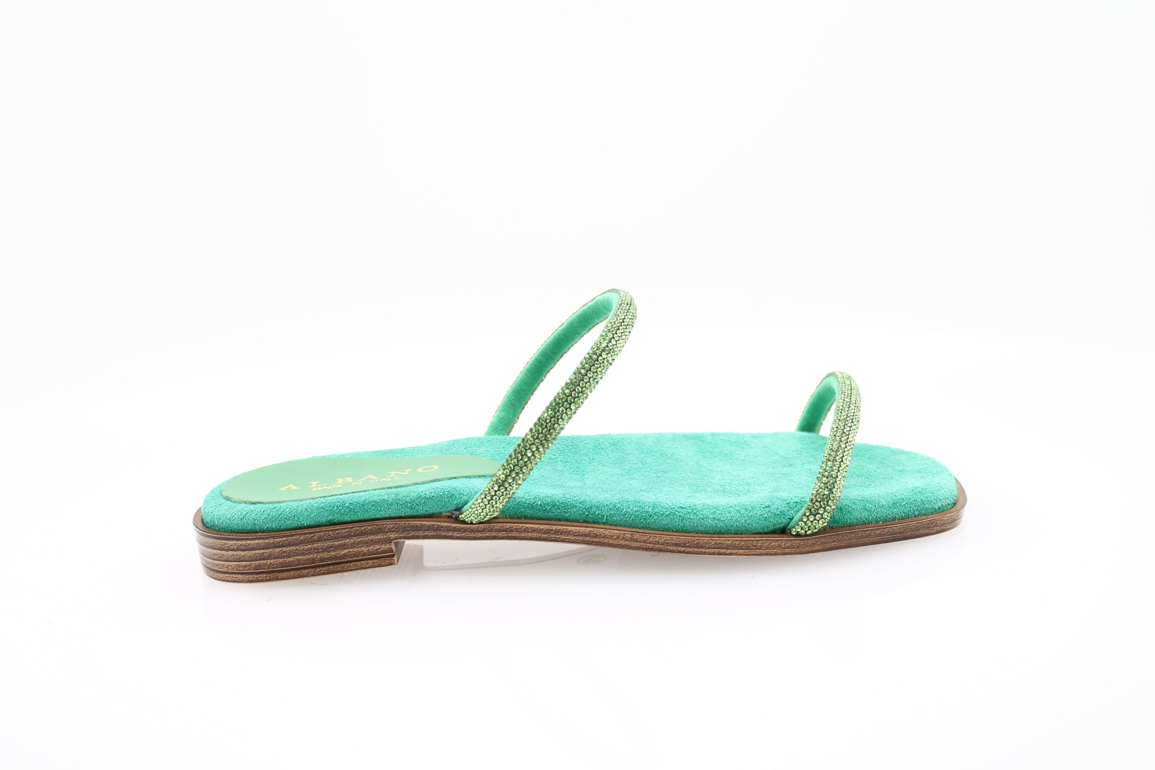 Les mules plates en daim Albano incarnent à la perfection le mariage entre style et confort. Avec leur somptueuse couleur verte, elles apportent une touche d’originalité et de sophistication à n’importe quelle tenue. Le détail en strass ajoute une finition précieuse, parfaite pour celles qui aiment allier élégance et modernité.