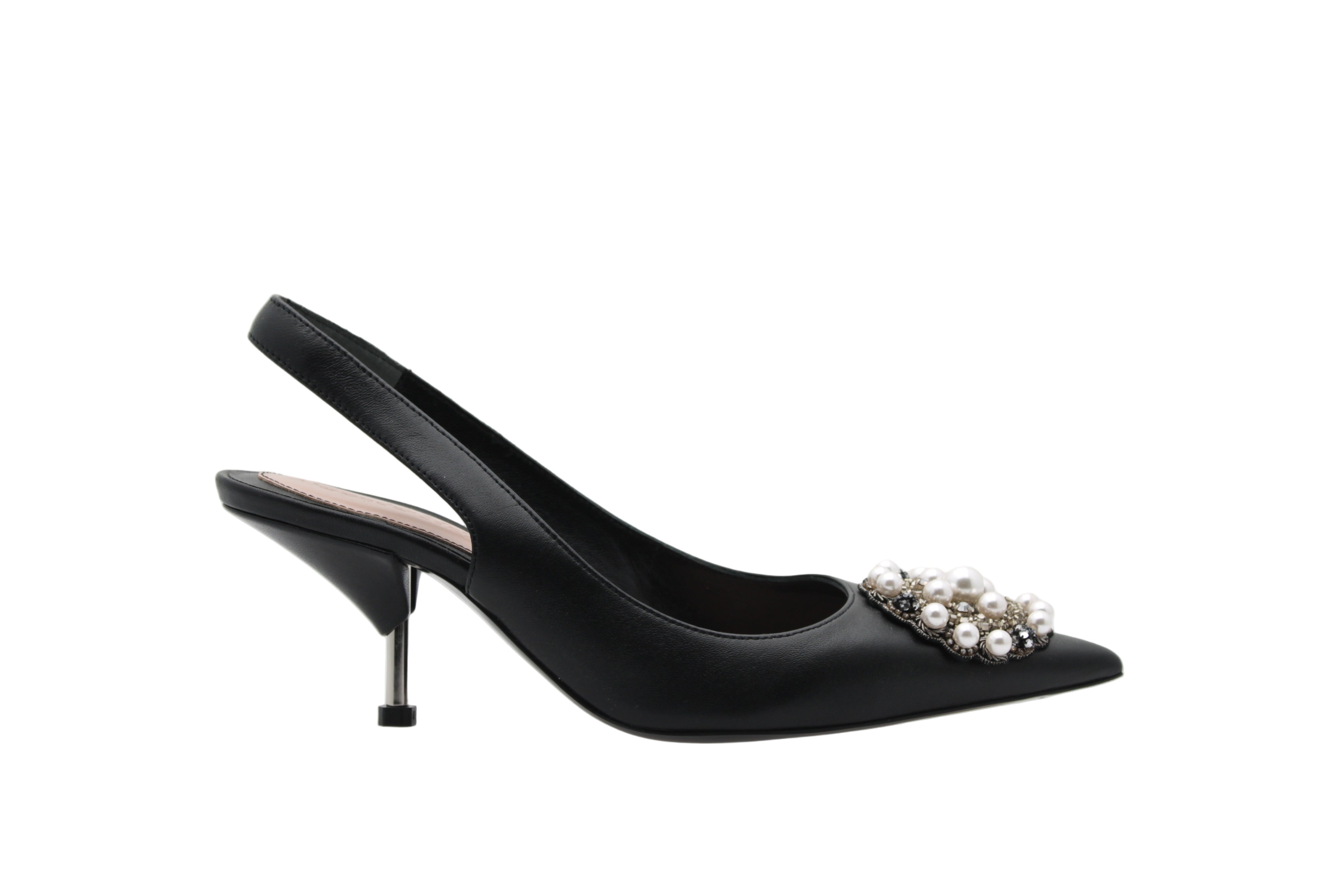 Féminin, audacieux et délicatement orné, l’escarpin Pearl Patch Sling de Alexander McQueen incarne la sophistication dramatique propre à la maison britannique. Conçu en cuir noir lisse, il dévoile une silhouette élancée sublimée par un travail ornemental remarquable.