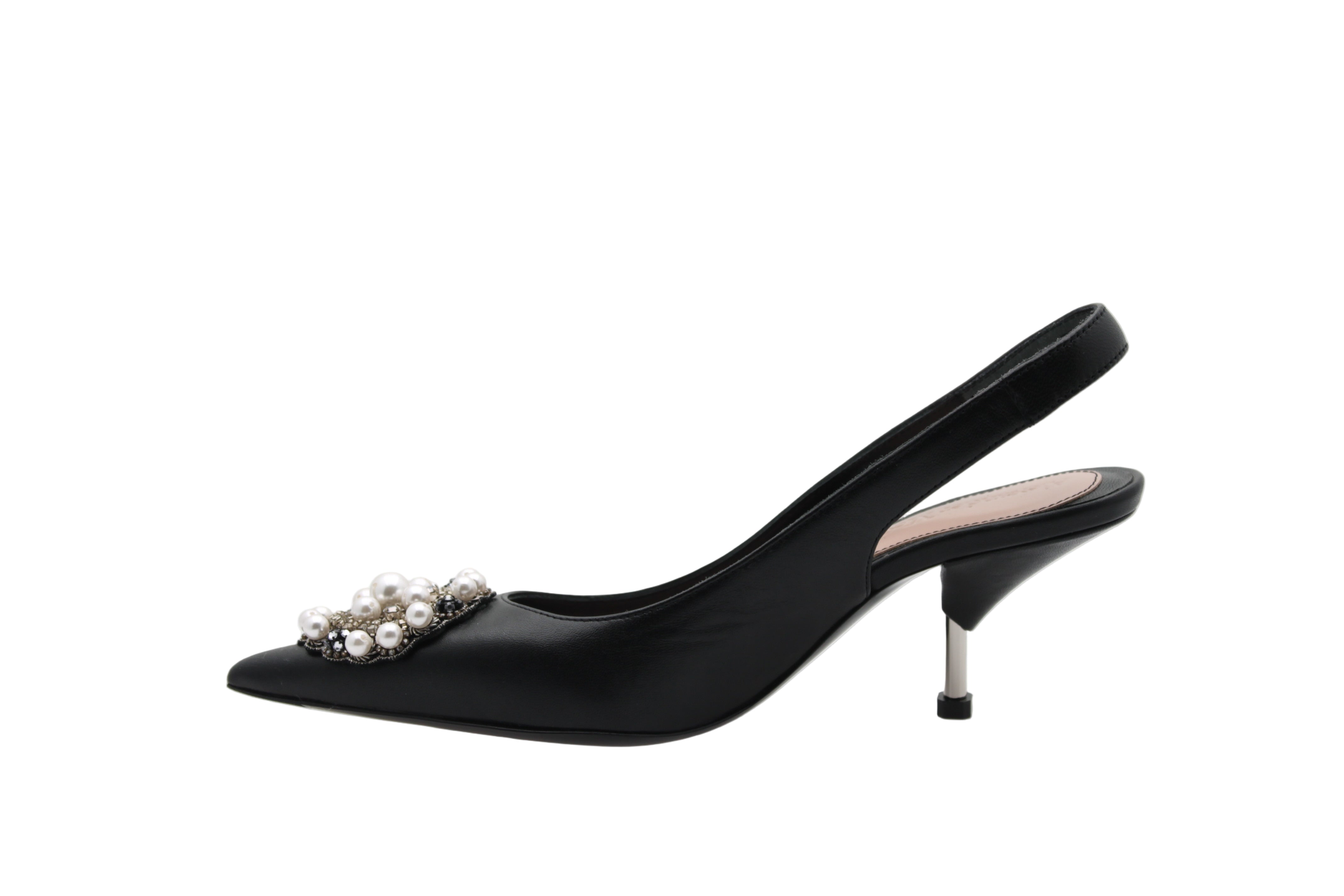 Ce modèle slingback repose sur un talon de 5 cm au design signature : fin, métallique et légèrement géométrique, offrant une allure moderne et sculpturale. À l’avant, un patch luxueux composé de perles blanches, cristaux et éléments argentés crée un jeu de lumière délicat, transformant l’escarpin en véritable bijou. La bride arrière élastiquée assure un maintien confortable tout en conservant une ligne épurée.