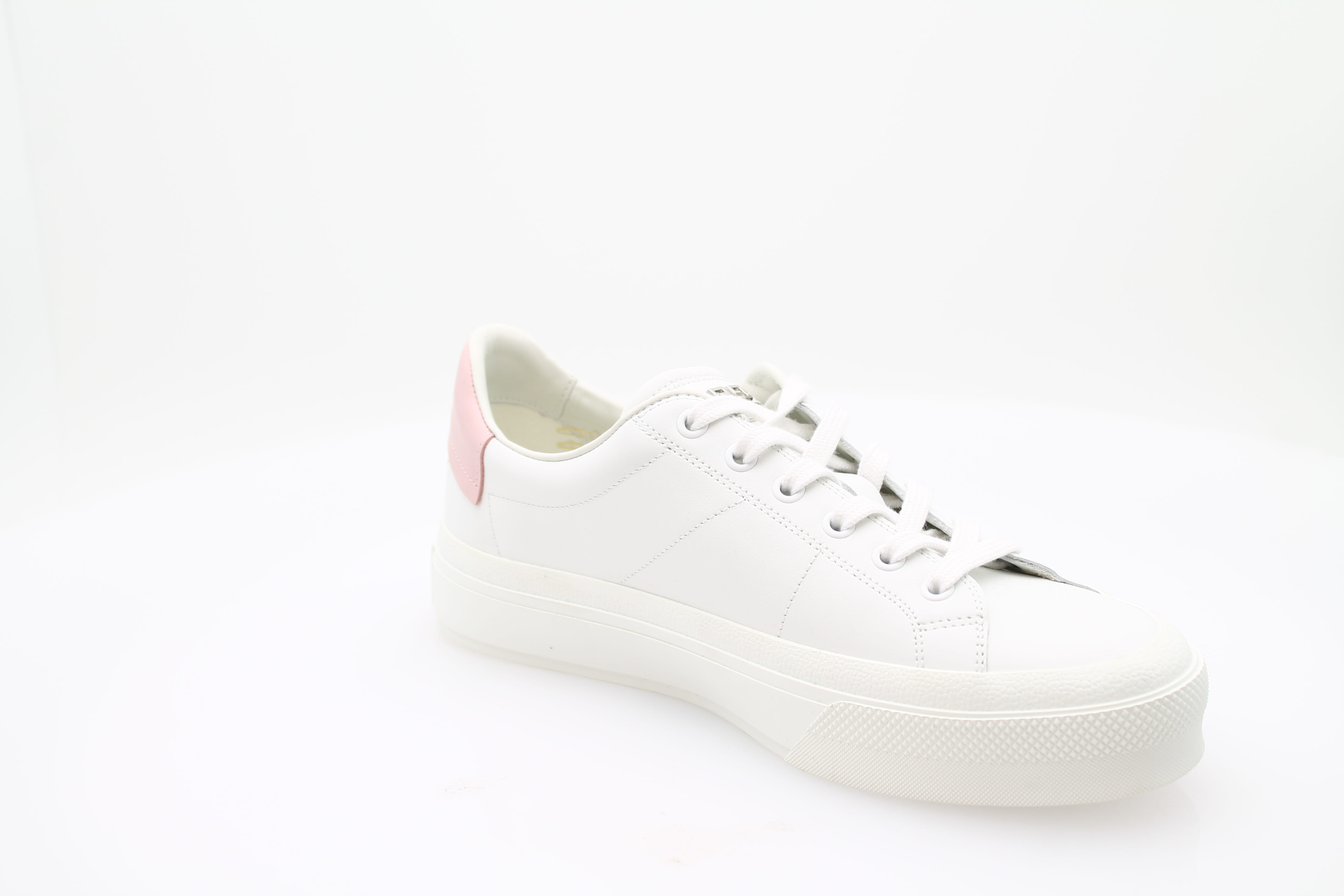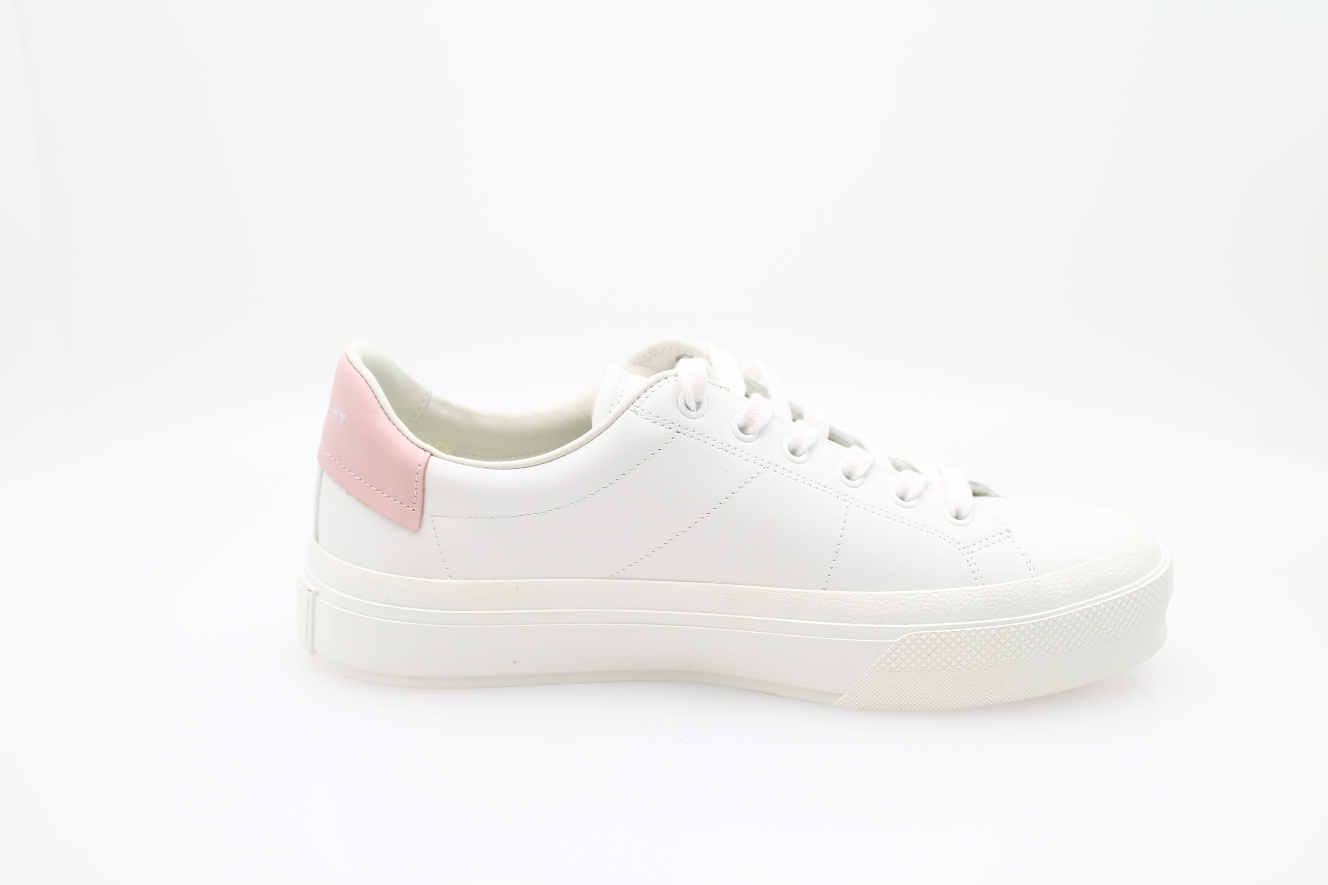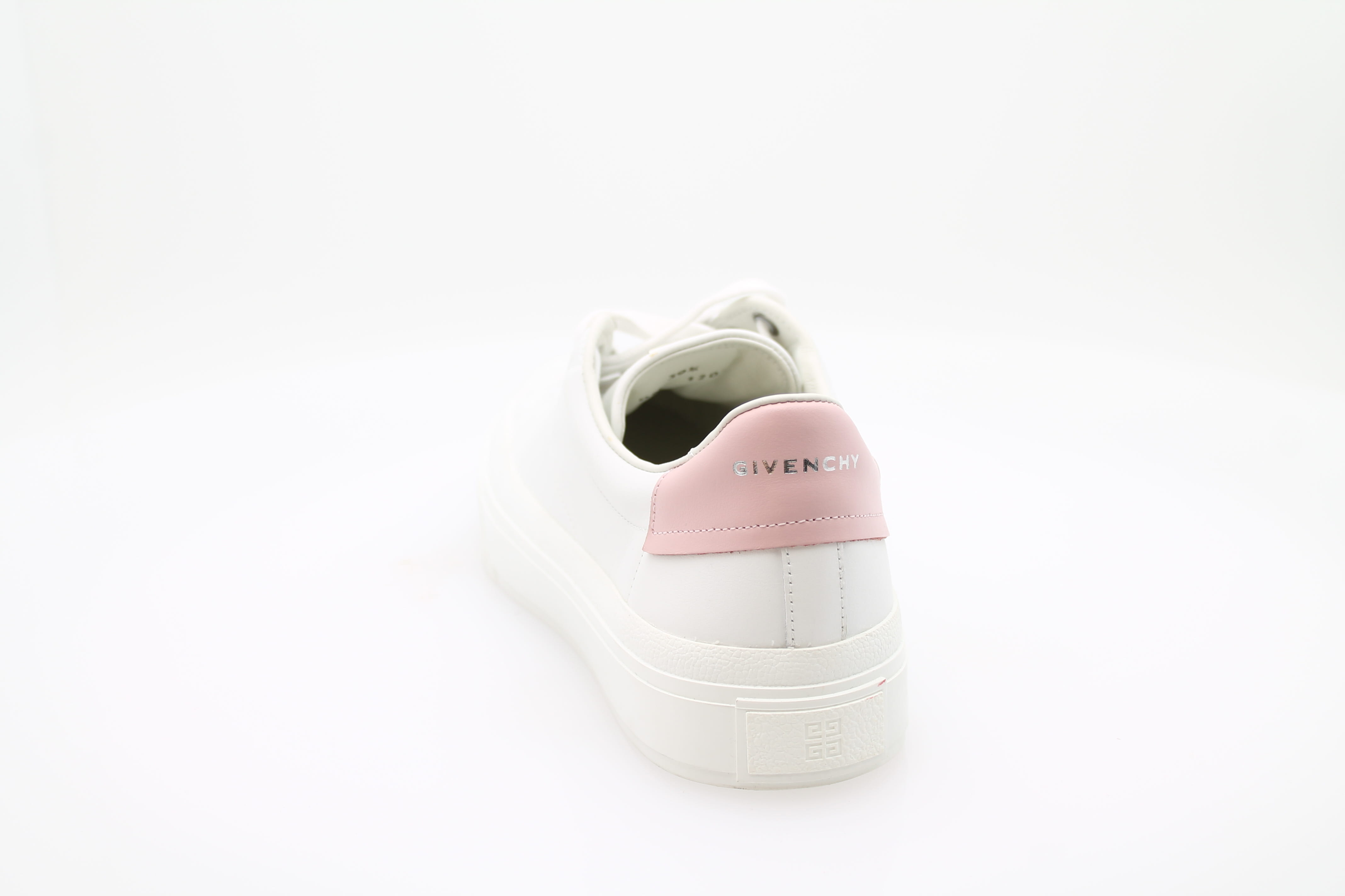 Baskets à lacets Givenchy en cuir blanc avec des accents rose subtils. Conçues avec un extérieur et un intérieur en cuir de haute qualité, elles offrent confort et durabilité. La signature Givenchy est discrètement apposée, garantissant élégance et authenticité.