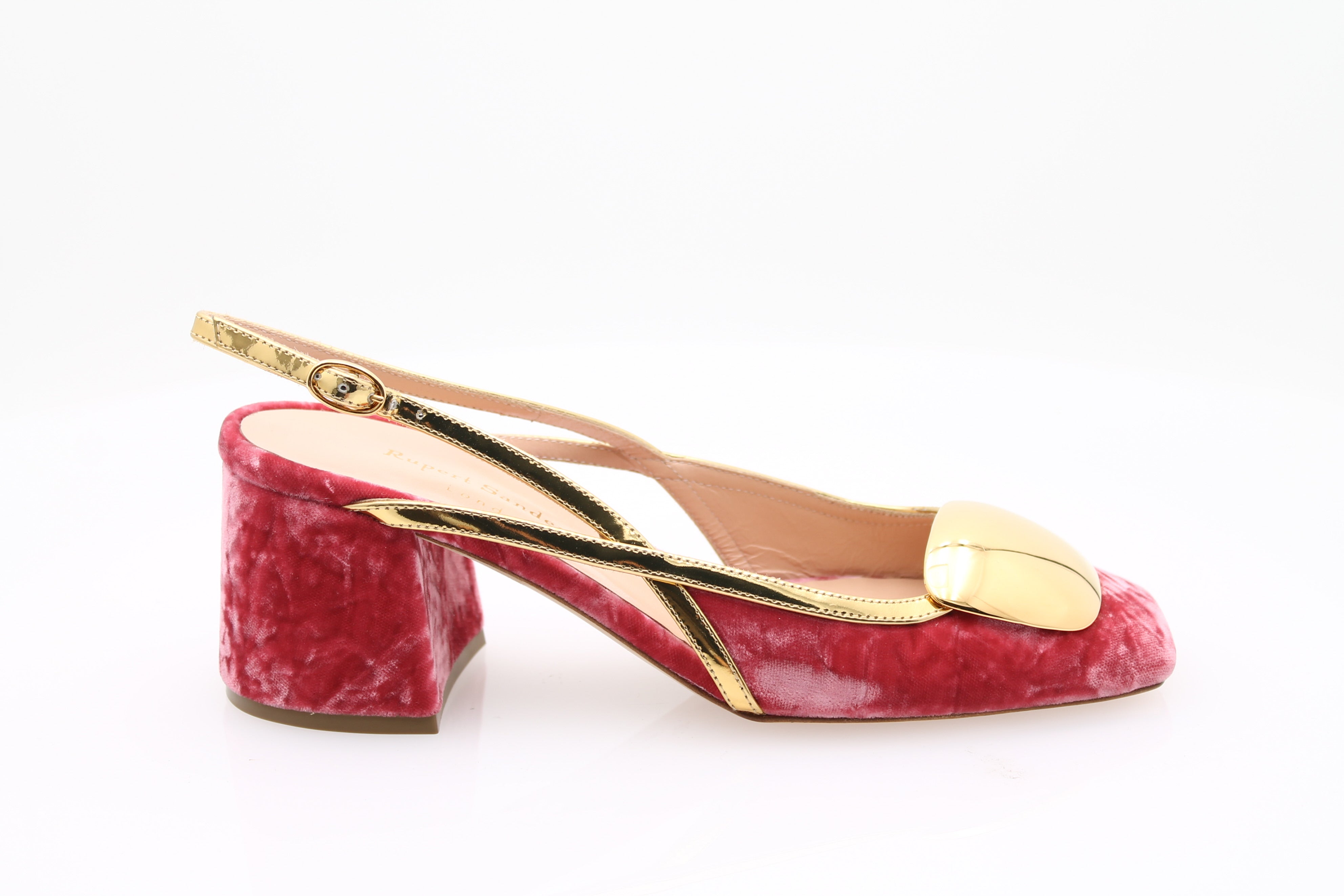 Les Cavella Sling de Rupert Sanderson incarnent le parfait équilibre entre raffinement et modernité. Conçues en velours magenta uni, elles offrent une douceur incomparable et un style sophistiqué. Leur silhouette élégante est sublimée par une pierre dorée emblématique à l’avant, ajoutant une touche de luxe subtile.