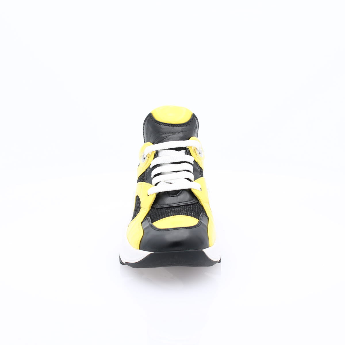 The combination of patent leather and transparent inserts gives these sneakers a modern and sophisticated look . The yellow and black color-block style adds a dynamic and original touch , perfect for those who like to assert their style.