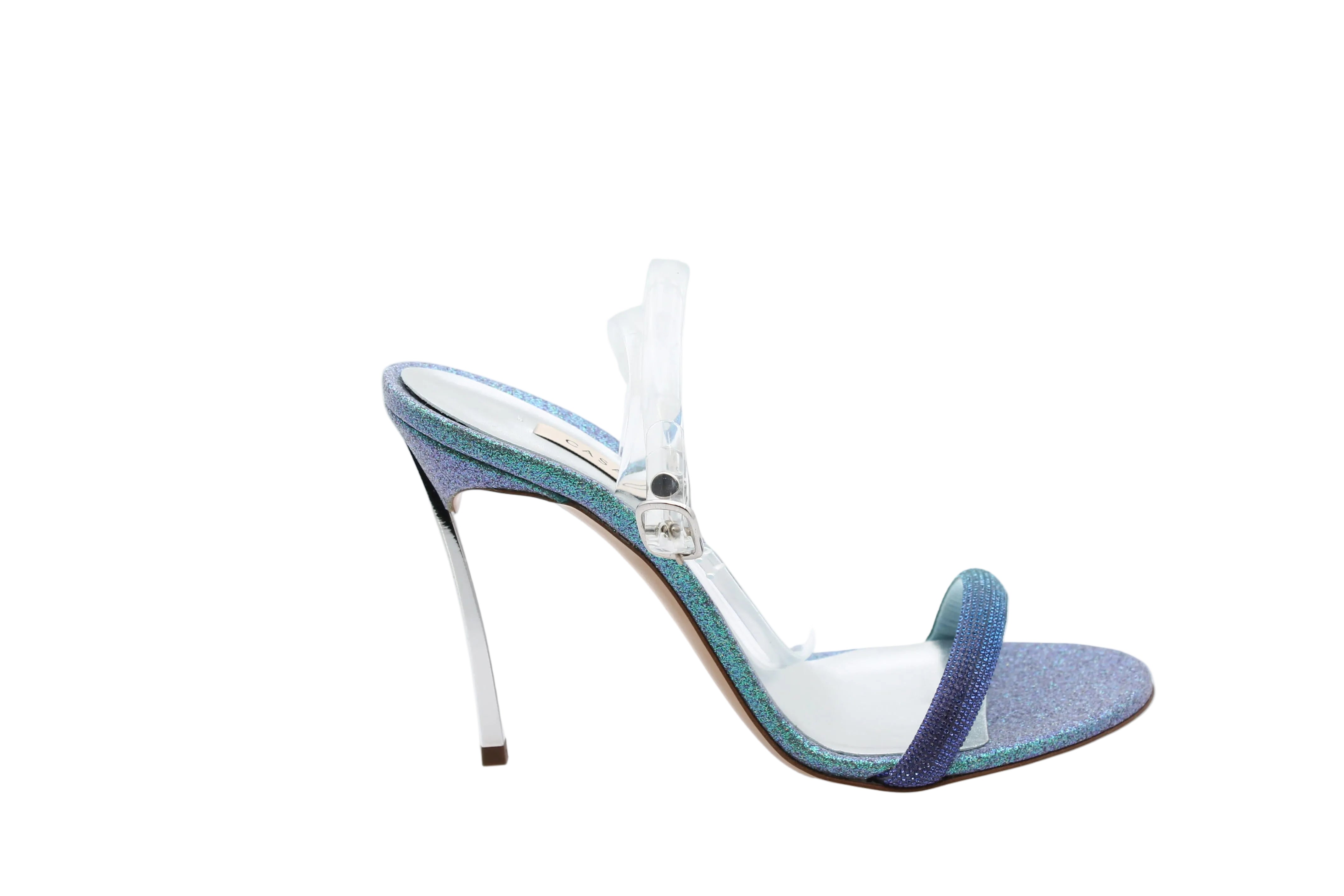 Made from transparent blue and purple leather, these shoes combine elegance and modernity with a 10cm heel.