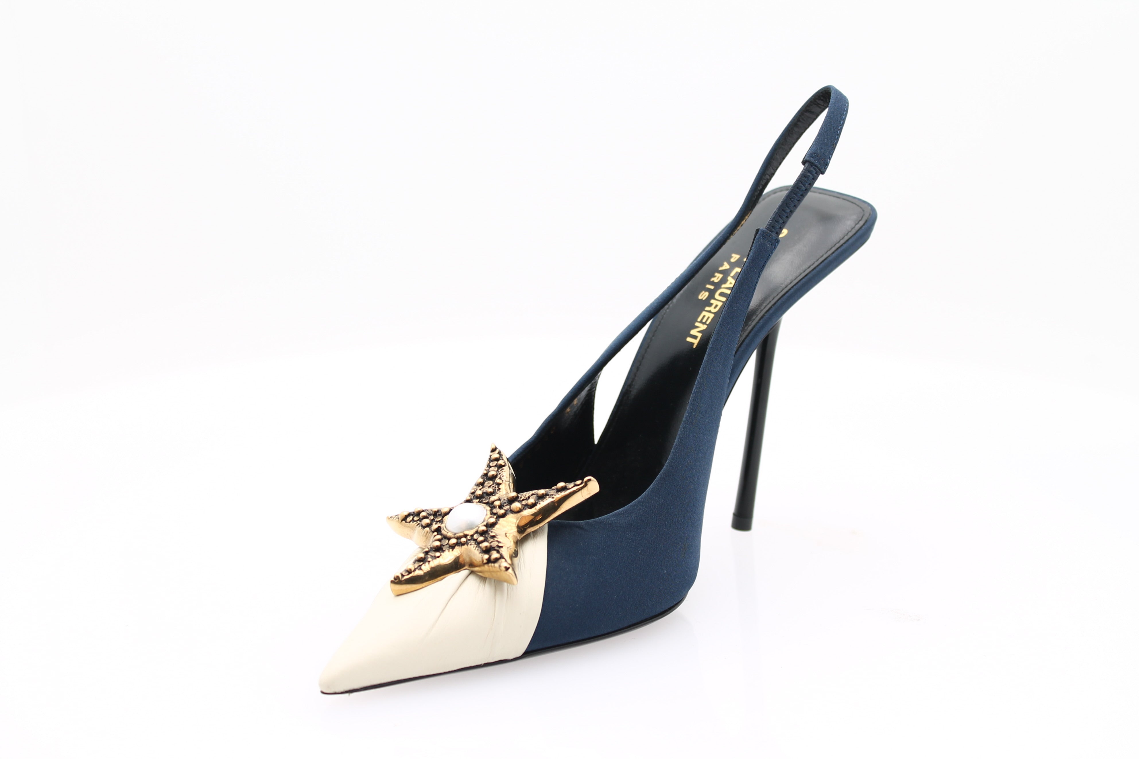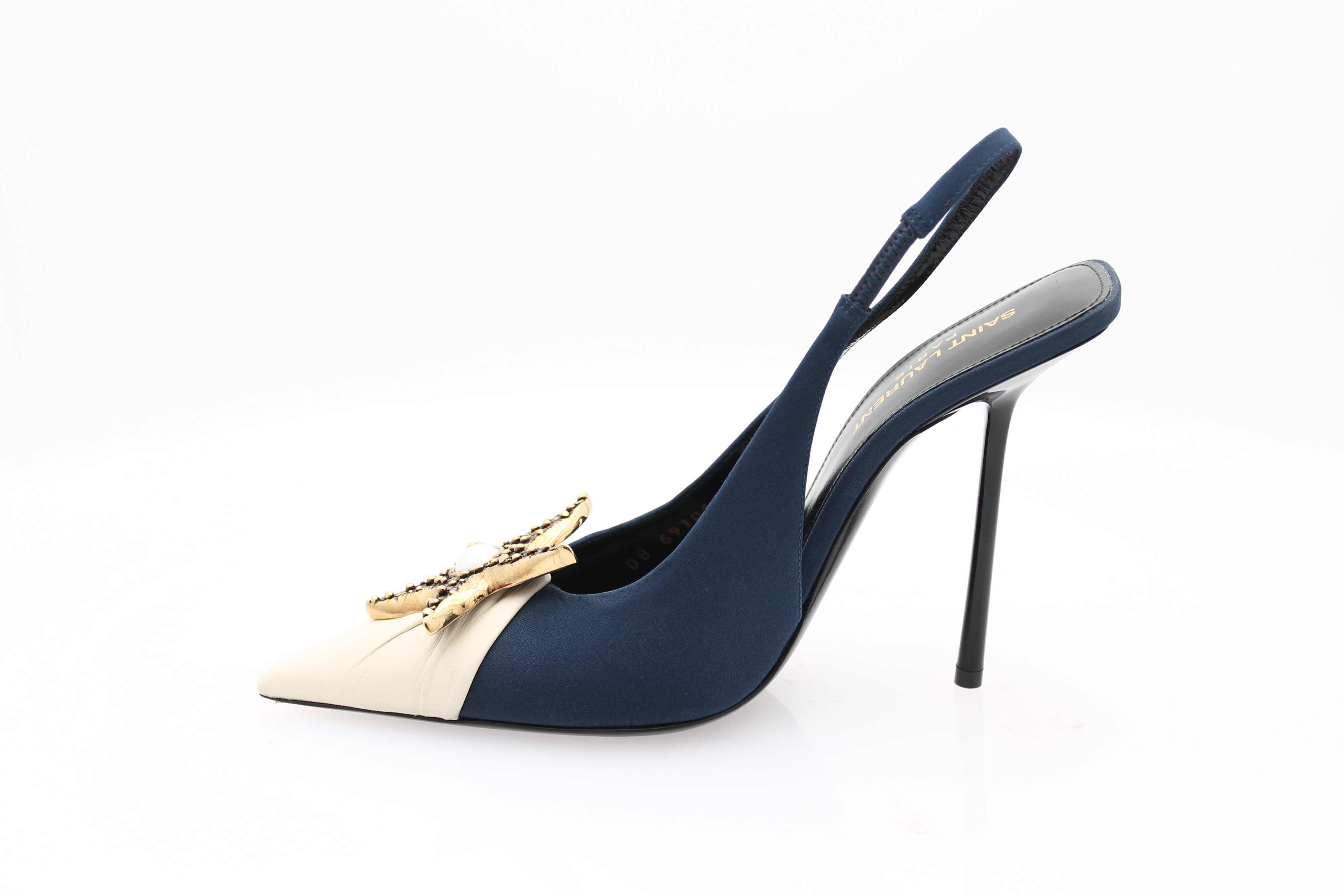 Dramatic, graphic, and exquisitely refined, the Ricqua 115 Slingback embodies the couture audacity characteristic of Saint Laurent . This slingback style combines a deep blue with an ivory toe , creating a sophisticated contrast that enhances the silhouette.