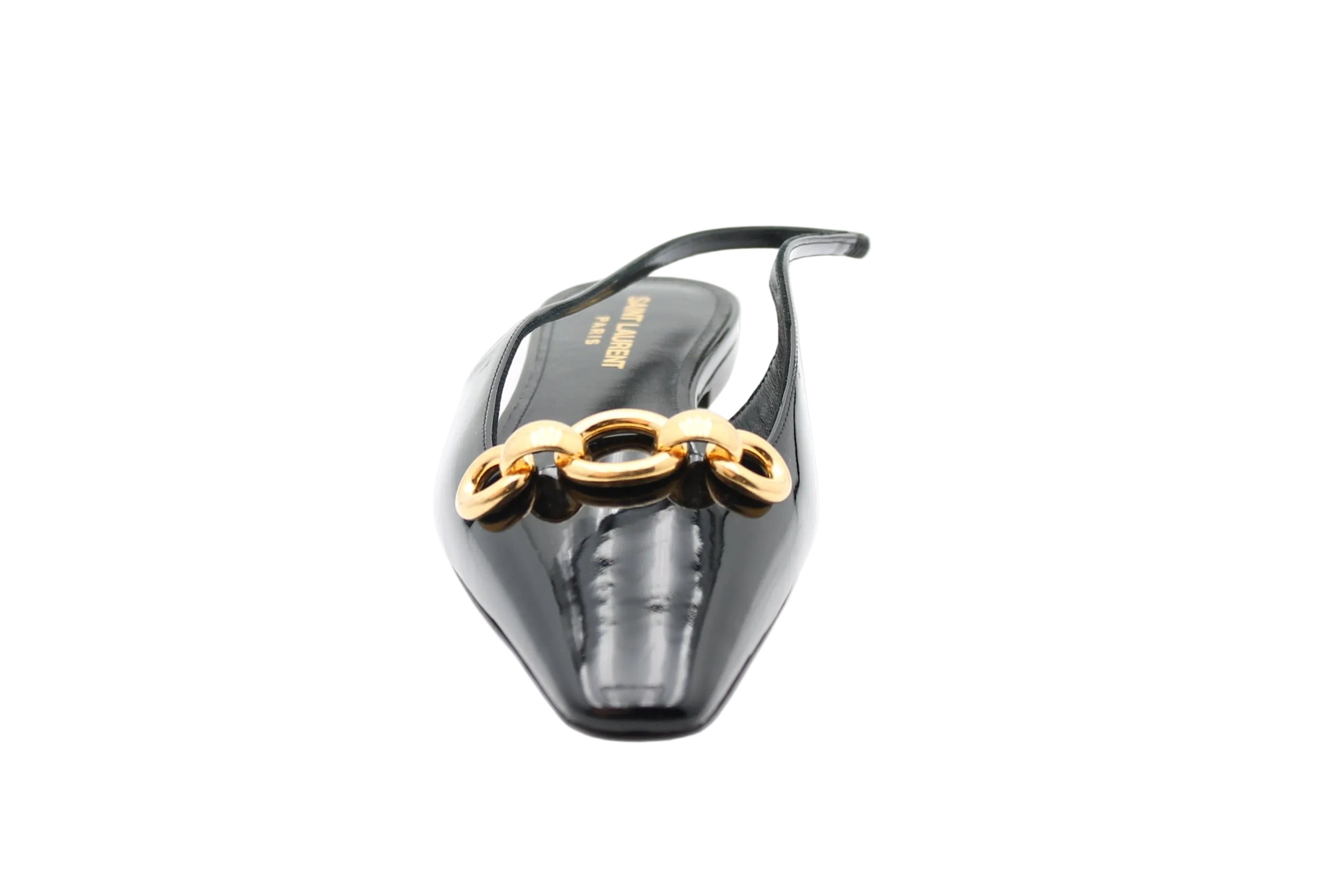 The Silvana 05 Slingback Ballerina flats in black by Yves Saint Laurent are designed to offer unparalleled elegance and contemporary sophistication . Featuring gold embellishments at the front and a square toe , they embody modern refinement while reflecting the legendary craftsmanship of the house.