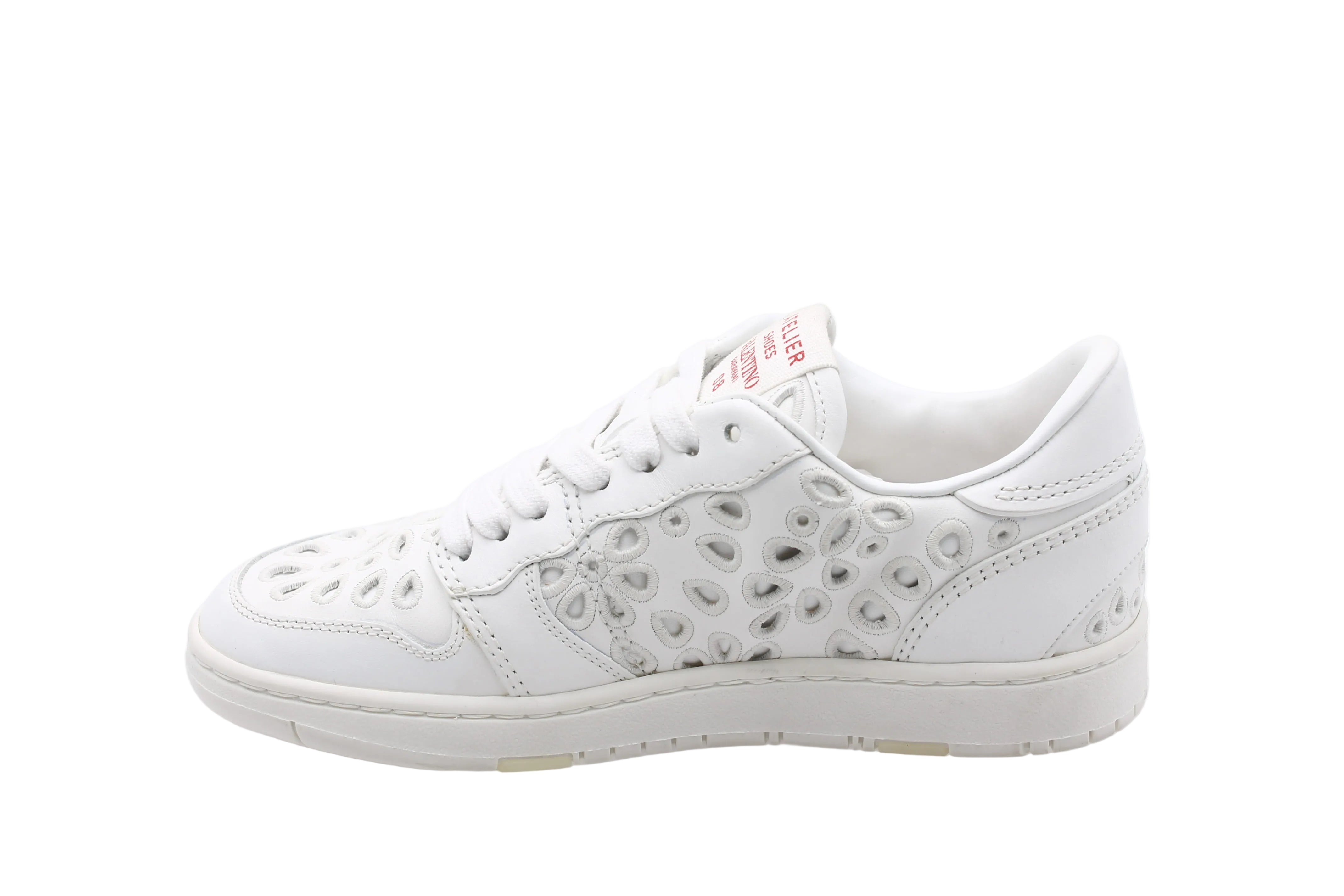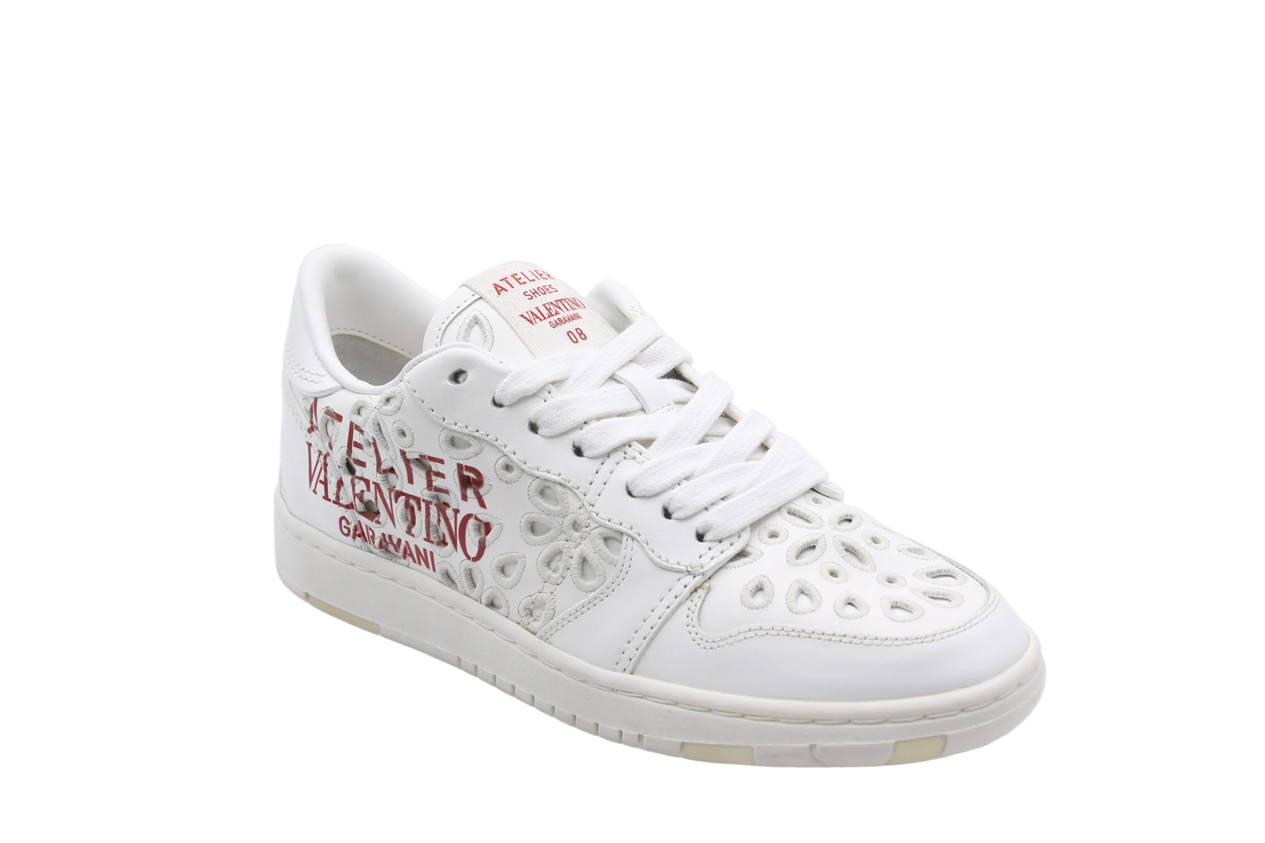 Crafted from high-quality white leather, it features bold red writing and perforated details for a unique look.