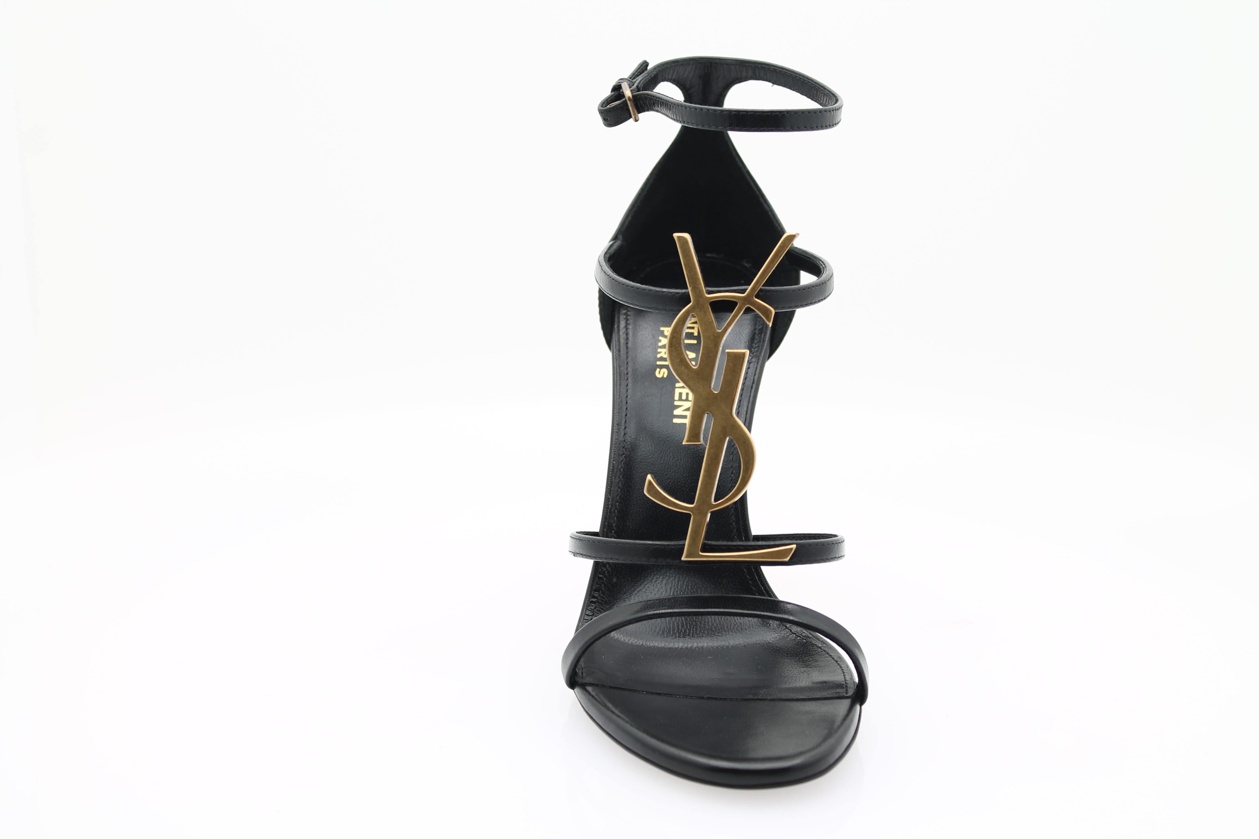 Crafted from refined black leather , they stand out with their delicate straps and their iconic Cassandre logo in gold metal , subtly affixed to the front.