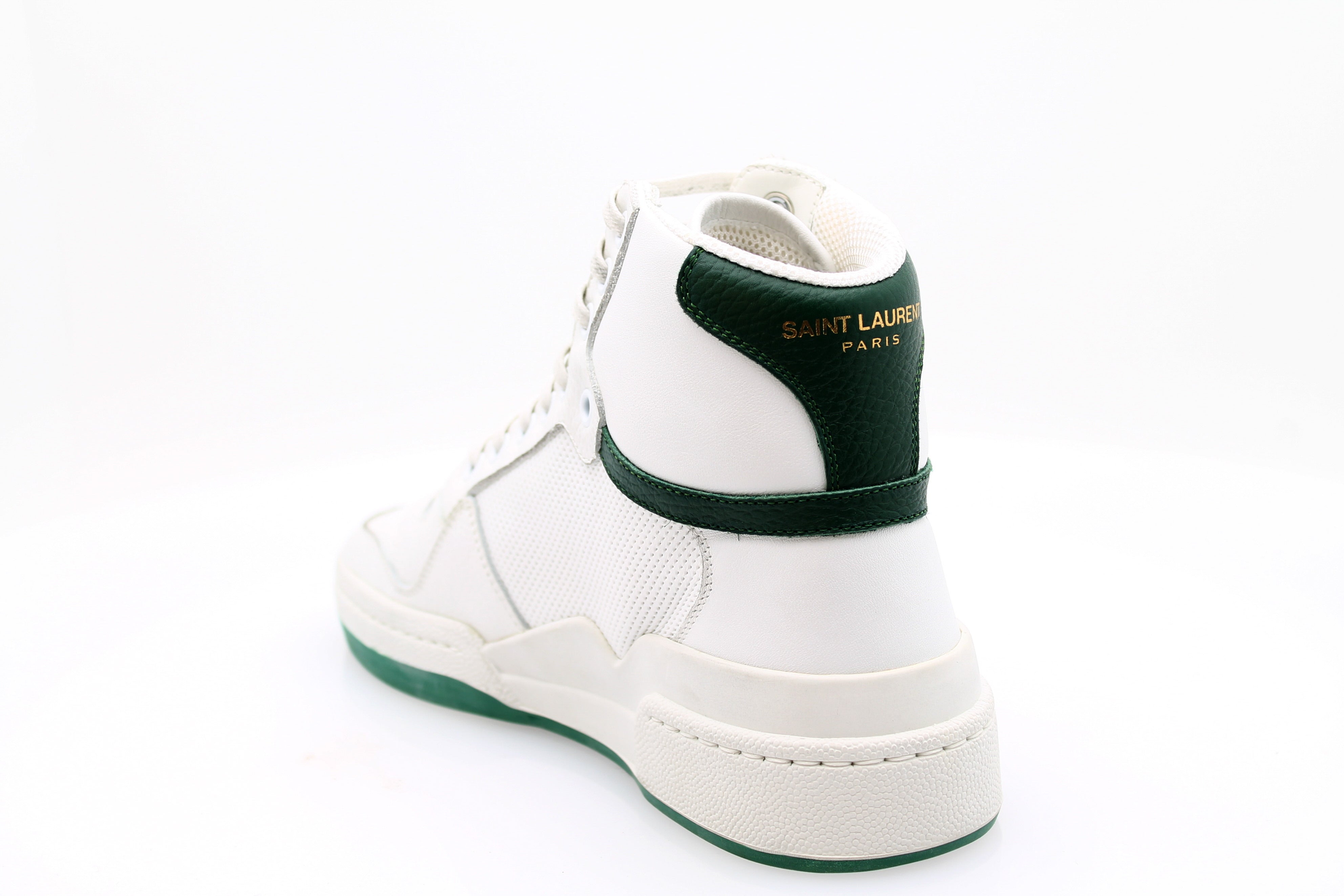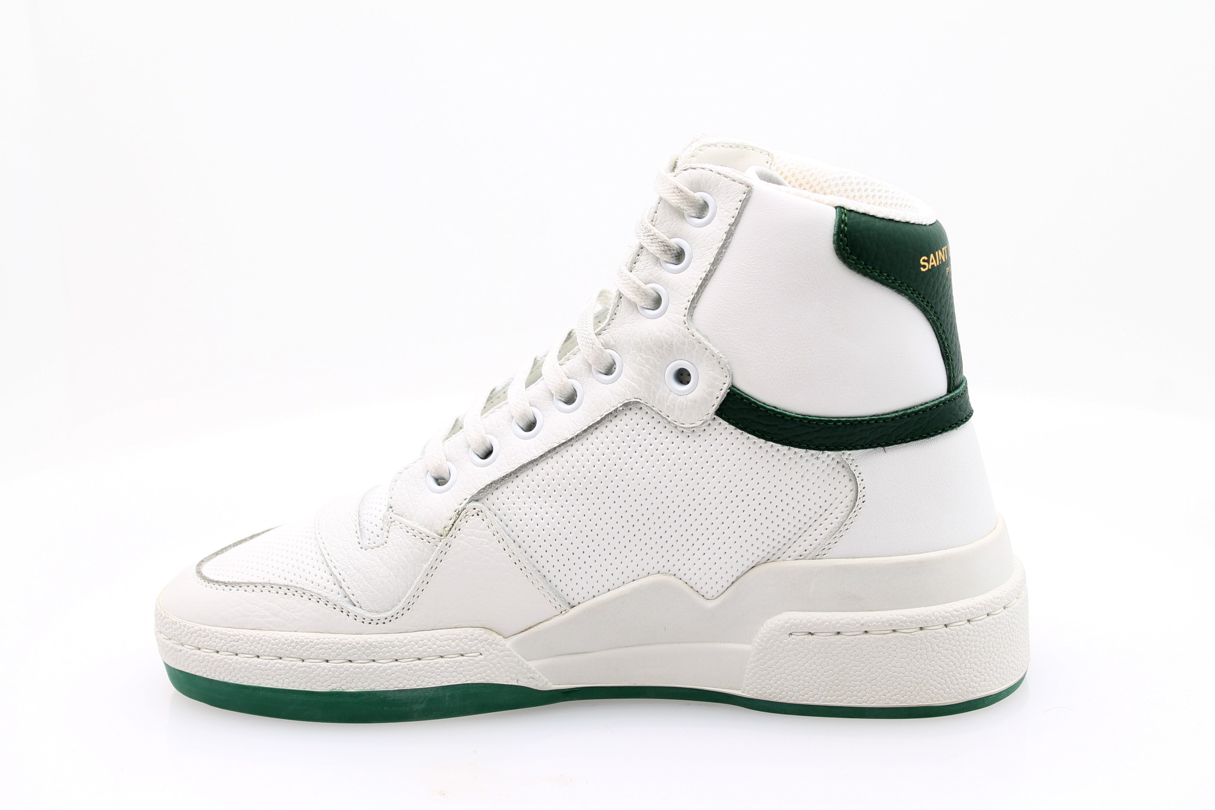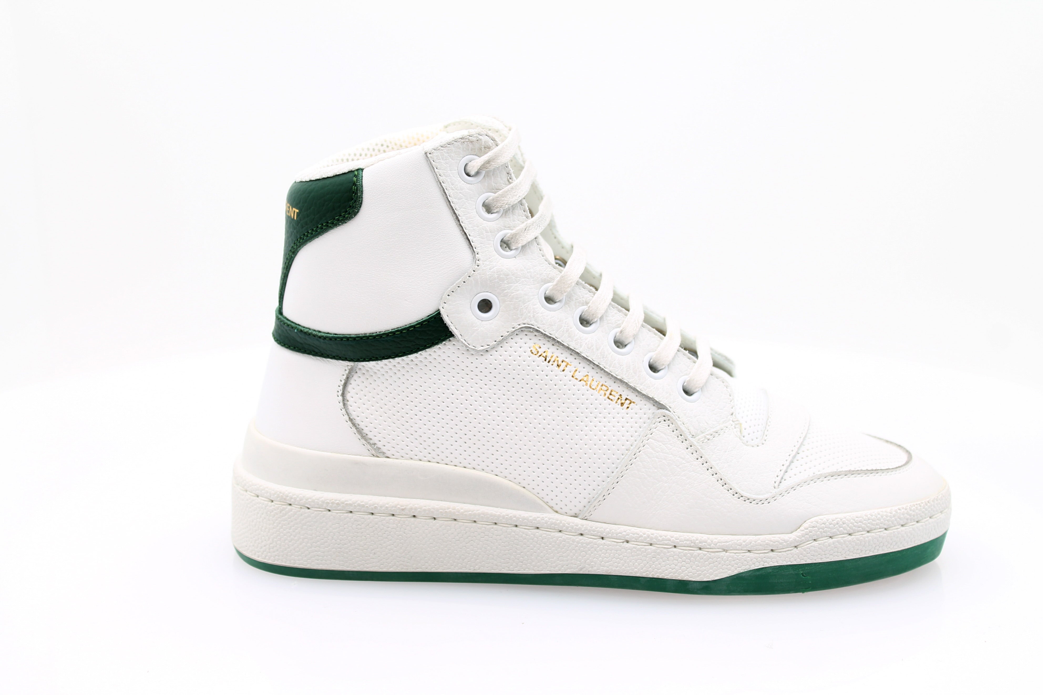 The Yves Saint Laurent SL24 High-Top Sneakers embody a perfect marriage of urban style and luxury . Crafted from high-quality grained leather , they feature a modern silhouette and refined design. Their white color with green accents adds a touch of freshness while maintaining an elegant look. Offering optimal comfort , these sneakers are ideal for those seeking both style and practicality for everyday wear.
